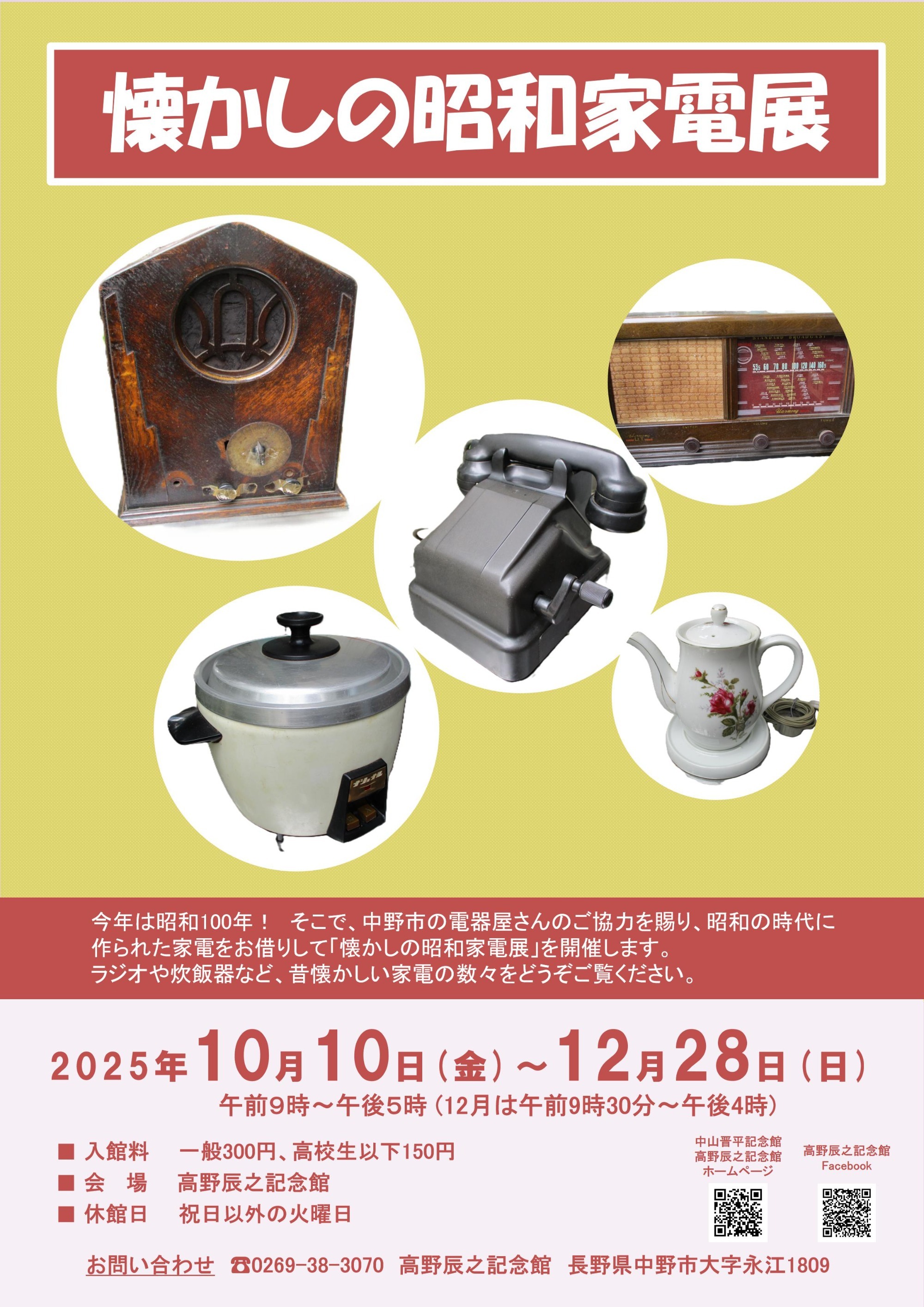 今年は昭和100年! そこで、中野市の電器屋さんのご協力を賜り、昭和の時代に作られた家電をお借りして「懐かしの昭和家電展」を開催します。ラジオや炊飯器など、昔懐かしい家電の数々をどうぞご覧ください。