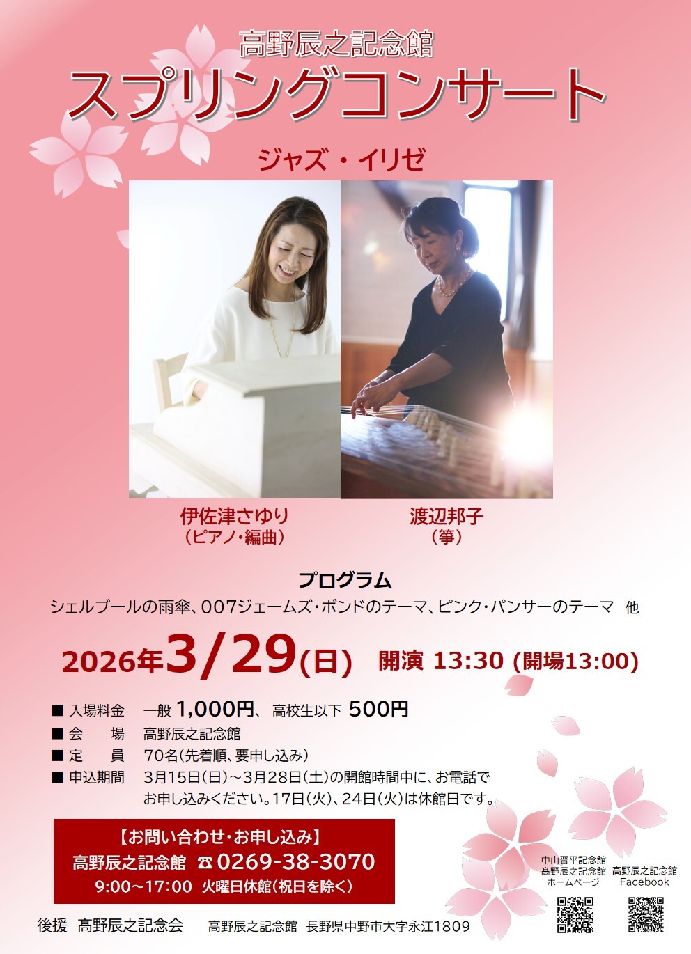 伊佐津さゆりさん(ピアノ・編曲)と渡辺邦子さん(箏)によるユニット「ジャズ・イリゼ」のコンサートを開催いたします。和と洋が融合した、お二人の息の合った素敵な演奏をお楽しみください。